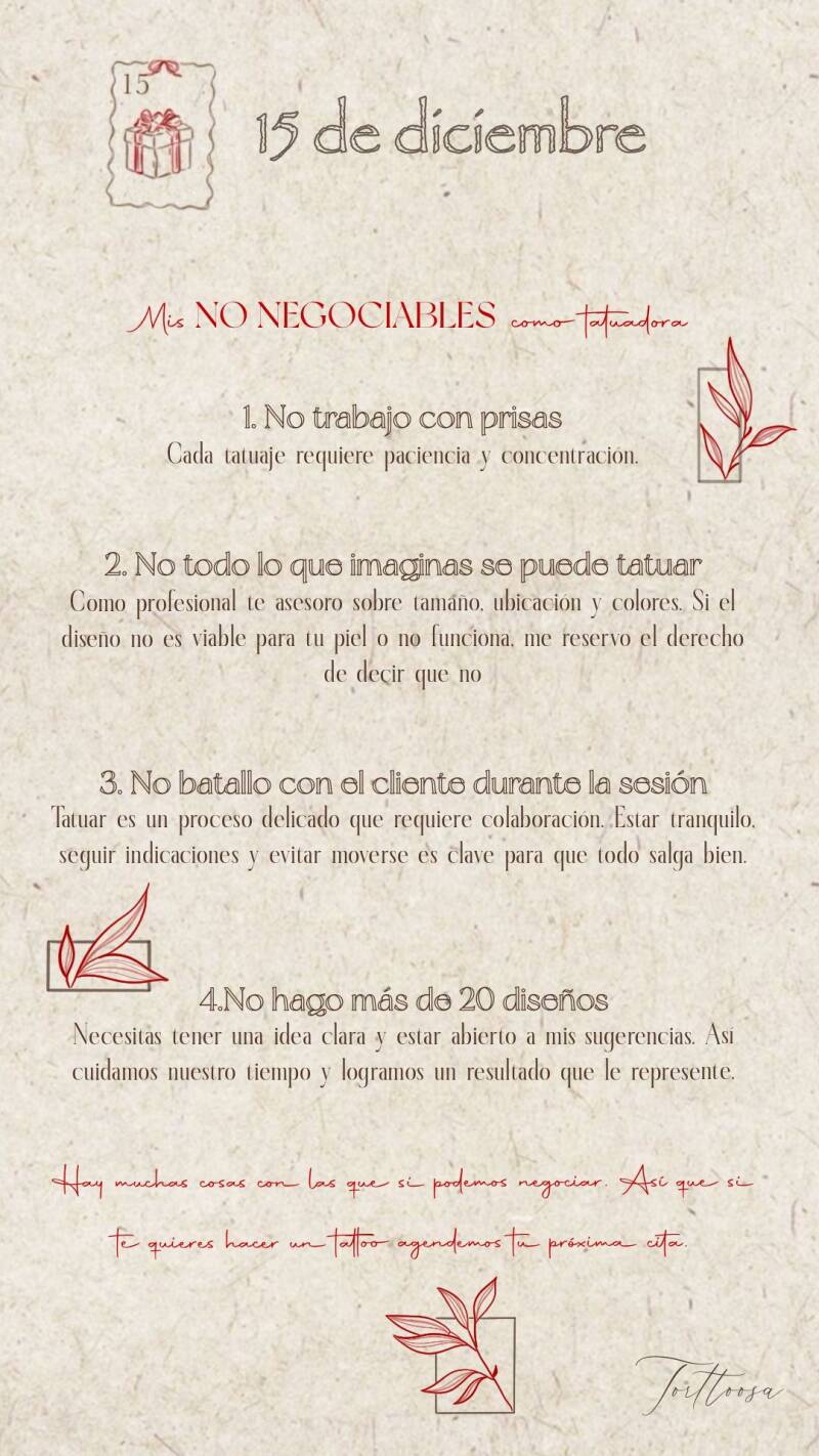Entendemos la diferencia que tiene que haber entre cliente y tatuador, por eso intentamos respetar lo máximo posible las ideas, maneras y gustos de nuestros clientes; sin embargo, también nos gusta que el trabajo llegue a ser lo MÁS cómo posible para ambas partes, que el proceso sea lo más llevadero posible y conisderamos inteligente tener esta pequeña lista.