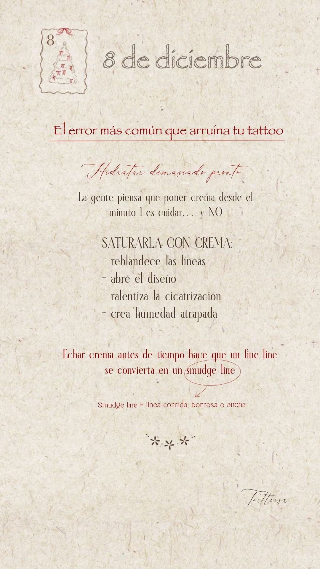 Poner crema desde el minuto 1 solo consigue reblandecer las líneas, abrir el diseño, ralentizar la cicatrización y crear humedad atrapada.